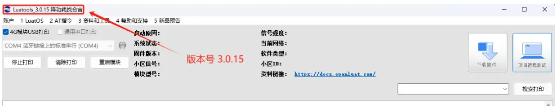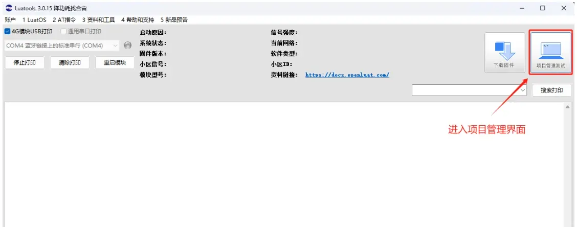 Luatools版本没问题的话,就点击Luatools右上角的“项目管理测试”按钮,如下图所示: