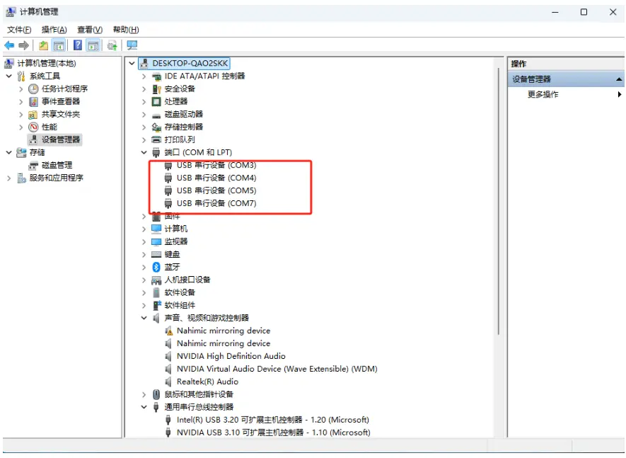 在电脑的设备管理器中,查看串口设备,如果出现了三个或者四个端口,则表示没有进入BOOT下载模式,如下图所示: