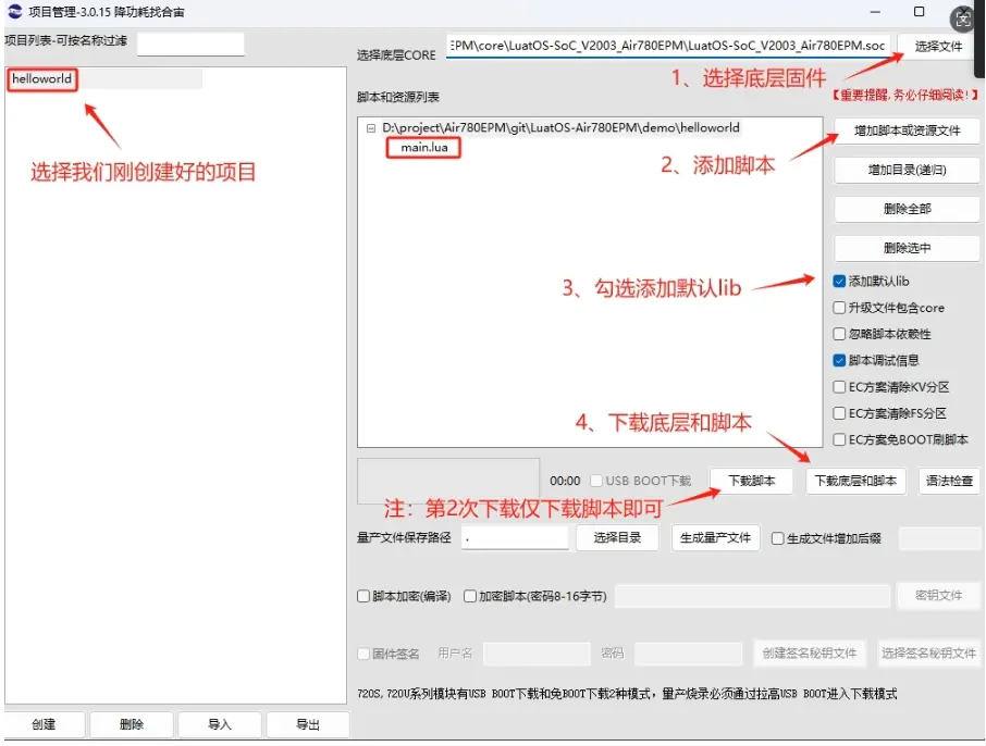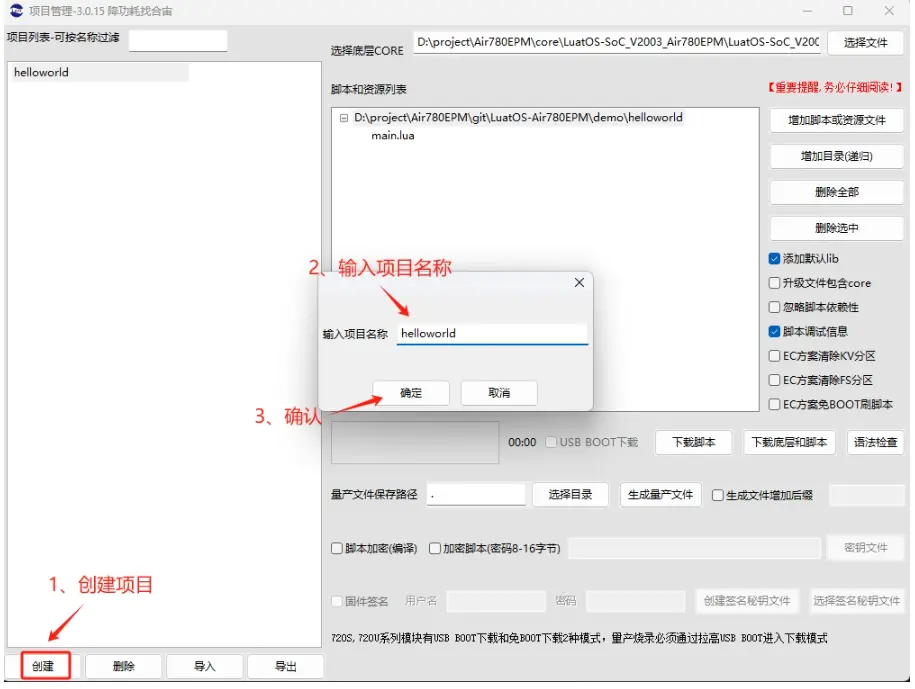 2. 参考软件环境清单,准备好Luatools,项目使用的内核固件,项目使用的脚本和资源文件。