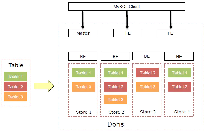 如果从表的角度来看数据结构,用户的一张 Table 会拆成多个 Tablet,Tablet 会存成多副本,存储在不同的 BE 中,从而保证数据的高可用和高可靠。