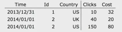 类似于字典搜索查询的键值对格式,Doris 中所有数据分成两列:Key 列和 Value 列。如下图所示,Time、Id、Country 列共同组成 Key 列,Clicks、Cost 列为 Value 列。Key 列有序可进行快速查找,Value 列可以按照具体聚合类型内部完成数据聚合。