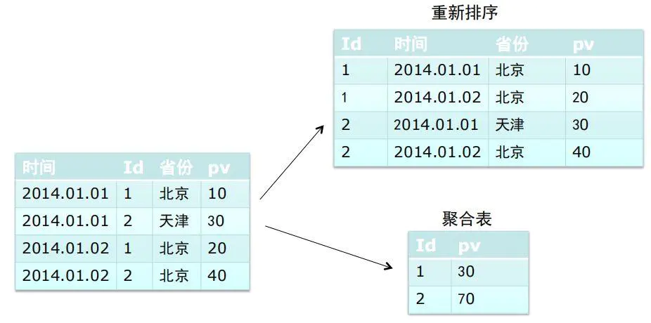 Doris 数据模型的一个显著特点是 Key 列全局唯一,因此存在相同 Key 值的不同 Value,则后面的数据与前面的数据自动做 ( SUM,MIN,MAX,REPLACE ) 等聚合处理。例如,下图中绿色方框中的两行,相同的 Key 值对应不同的 Value;因此,新的 Value 到达后,与前数据作 SUM 处理,得到最新的数据,不仅提升效率,还可提高数据处理的准确性。