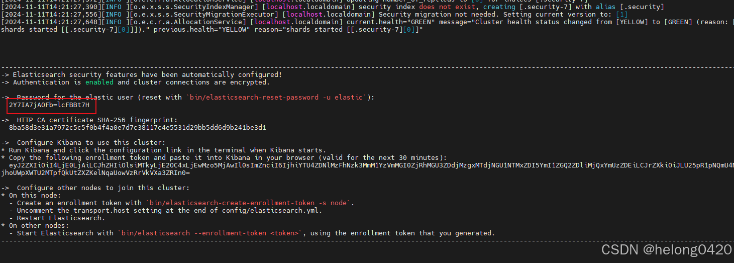 2.先在es的bin目录下,运行sh elasticsearch,这一步会生成es的账户及密码,记着自己的密码就行,后续可以重置。