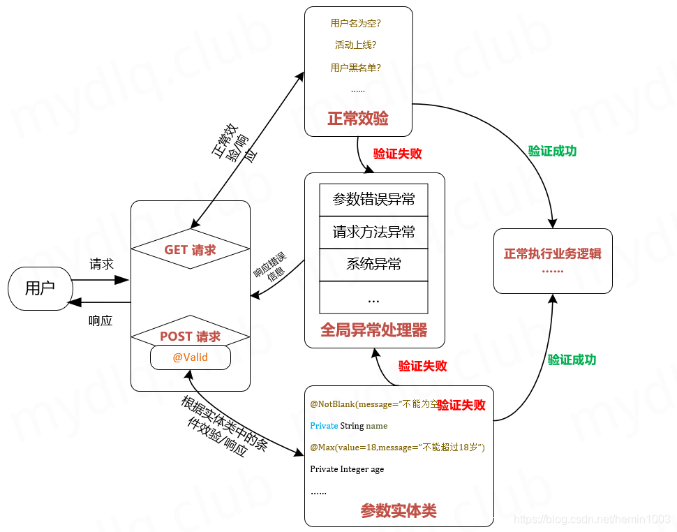 整个过程如下图所示,用户访问接口,然后进行参数效验,因为 @Valid 不支持平面的参数效验(直接写在参数中字段的效验)所以基于 GET 请求的参数还是按照原先方式进行效验,而 POST 则可以以实体对象为参数,可以使用 @Valid 方式进行效验。如果效验通过,则进入业务逻辑,否则抛出异常,交由全局异常处理器进行处理。