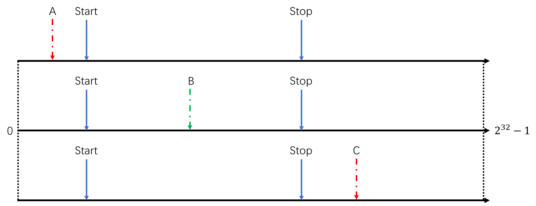 此时,如果读取到的CYCCNT实时值处在B区间,表示当前延时时间还未结束;如果读取到的CYCCNT实时值处在A或者C区间时,表示延时时间已到。