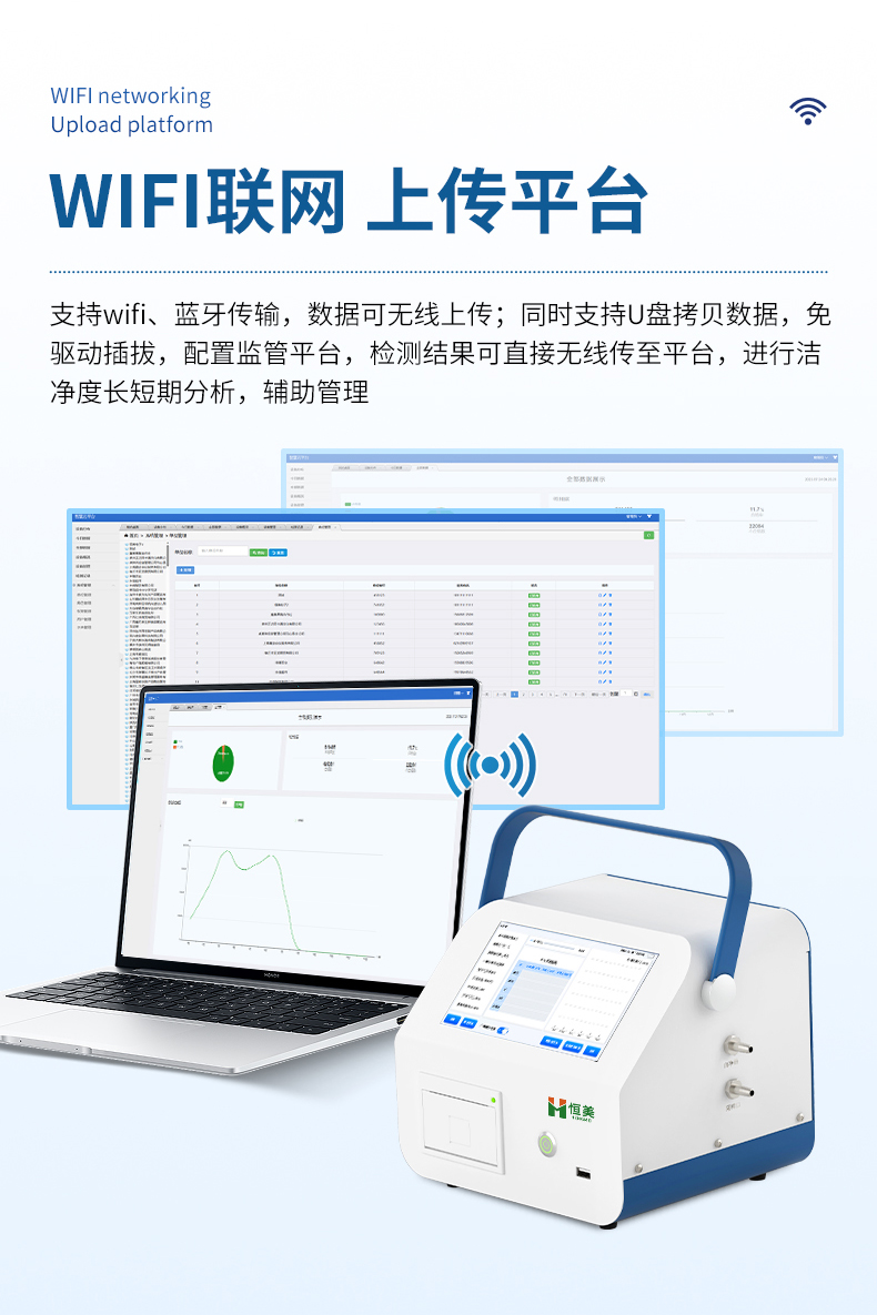 数据互联与高效管理:支持Wi-Fi数据传输和U盘导出,使得海量检测数据(1-10万条)的管理变得轻松。配合云端监管平台,可实现洁净度的长期趋势分析,帮助用户预测潜在风险,从“事后检测”转向“事前预防”,为精益生产提供数据支撑。