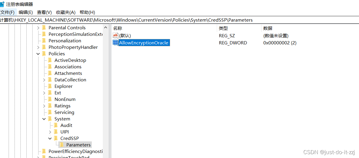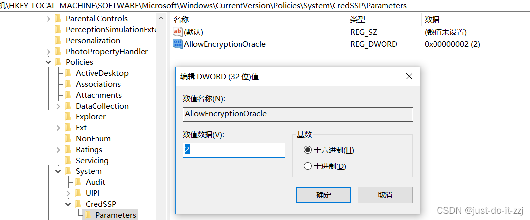 HKEY_LOCAL_MACHINE\SOFTWARE\Microsoft\Windows\CurrentVersion\Policies\System\CredSSP\Parameters”