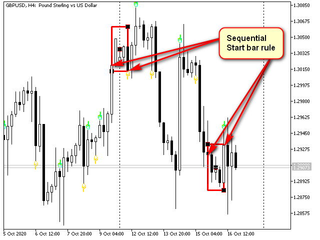 在第一阶段,发现不平衡情况-价格开始以比之前更快的速度向某个方向移动,最后形成的价格柱的收盘价高于或低于它之前的收盘价四个价格柱(指标中的Setup_Distance变量)。这就是 Setup 准备工作如何开始的。这种烛形是亮绿色和金色的,分别用拇指上下标记。更进一步,我会称之为“breakout(突破)”或“start(开始)”烛形。