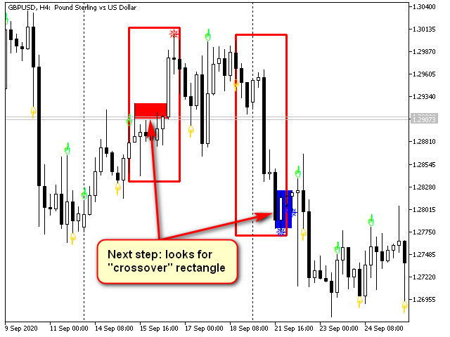 在第三阶段,赫兹期货量化需要确认快速运动段已经形成。其实,应该有一点修正。DeMark建议等待交叉口(intersection),在该交叉口处,当前或前一个柱最低价格(上升趋势期间)小于从第三个 交叉口 (Intersection_Min_Distance)开始的前一个柱的最高价格。这种情况标记为相应价格之间的填充矩形。在指示器的语音信息和说明图中,此阶段称为“Crossover(交叉)”。