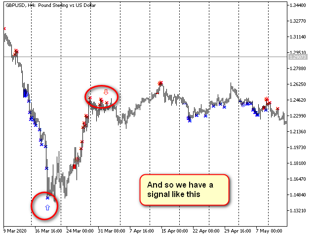 第四阶段开始倒计时(Countdown(倒计时))。在此期间,最后形成的柱的收盘价与距离当前柱两个柱(Countdown_Distance)的柱的最低价格(下降趋势)或最高价格(上升趋势)进行比较。当满足这些条件的第十三个柱(Countdown_Limit)形成时(关闭比左侧第二个烛形更极端),将显示信号箭头 。