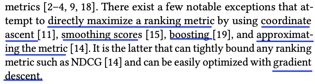 也可以利用一些方法直接最大化排序度量,或者利用一些技巧之后进而可以利用梯度下降来更容易地优化