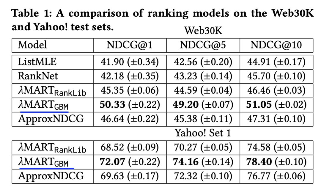 不同方法在数据集Web30K和Yahoo!上的效果对比如下