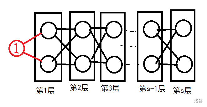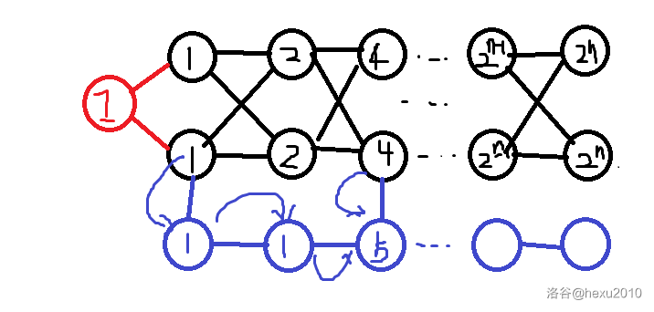于是,可以得出,源点到第 i i i 行的节点有 2 i − 1 2^{i-1} 2i−1 条最短路。然后,在考虑每个节点的编号问题。首先, 1 1 1 号和 2 2 2 号已经被用掉了,所以从 3 3 3 号开始考虑。从简单方便的方面去想,第 i i i 层的节点分别是 2 i + 1 2i+1 2i+1 和 2 i + 2 2i+2 2i+2 。接着,再是连边的事情。刚才提到了,第 i i i 层的节点分别是 2 i + 1 2i+1 2i+1 和 2 i + 2 2i+2 2i+2 ,可以得出第 i i i 层的节点分别是 2 i + 3 2i+3 2i+3 和 2 i + 4 2i+4 2i+4 ,所以有这几条边: ( 2 i + 1 , 2 i + 3 ) (2i+1,2i+3) (2i+1,2i+3), ( 2 i + 1 , 2 i + 4 ) (2i+1,2i+4) (2i+1,2i+4), ( 2 i + 2 , 2 i + 3 ) (2i+2,2i+3) (2i+2,2i+3), ( 2 i + 2 , 2 i + 4 ) (2i+2,2i+4) (2i+2,2i+4)。