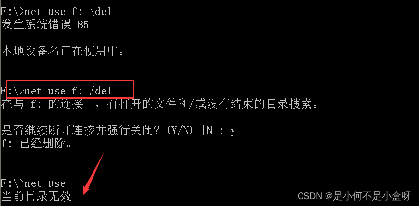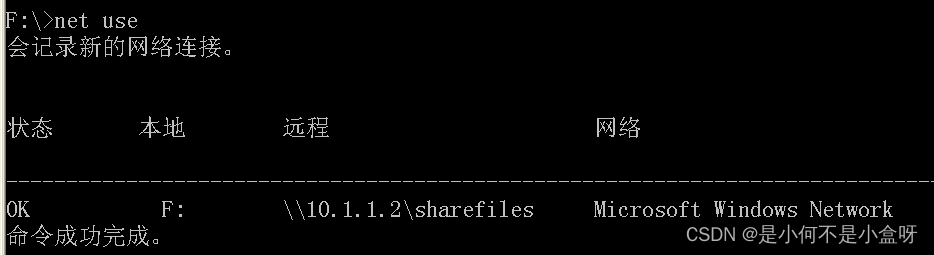 假如我们要删除这个共享资源,可以用命令:net use f: /del 删除: