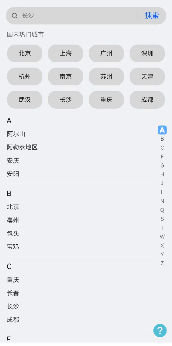 - 下方城市列表通过AlphabetIndexer组件实现拼音索引条,通过滑动选择城市首拼,快速定位相关首拼城市。