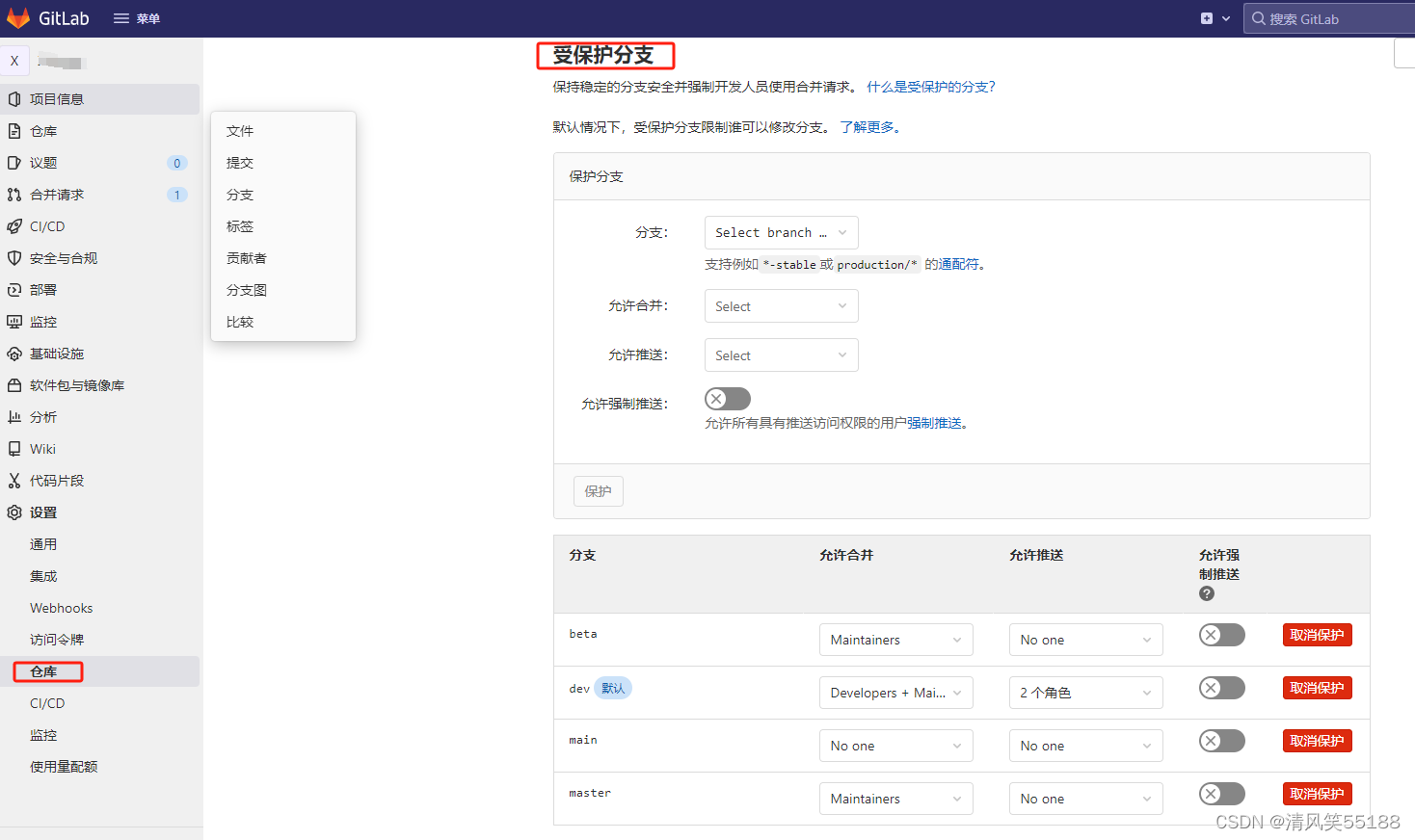 3.在gitLab上对master去掉“受保护”