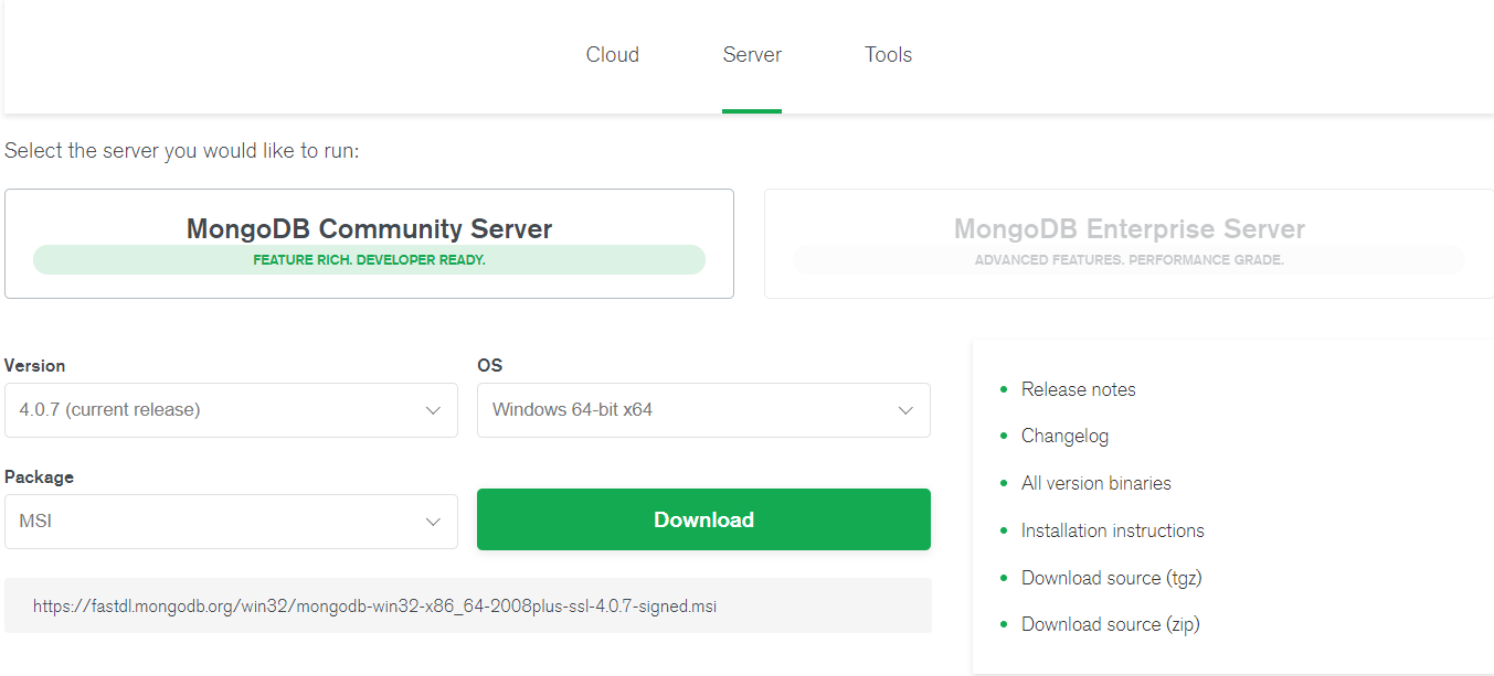 MongoDB提供了可用于32位系统和64位系统的预编译二进制包(新版本没有了32位系统的安装文件),你可以进入MongoDB官网下载安装,MongoDB的预编译二进制包的下载地址为:https://www.mongodb.com/download-center/community,打开之后会看到如下图,直接点击Download下载即可,也可以在Version中选择你想要的版本:
