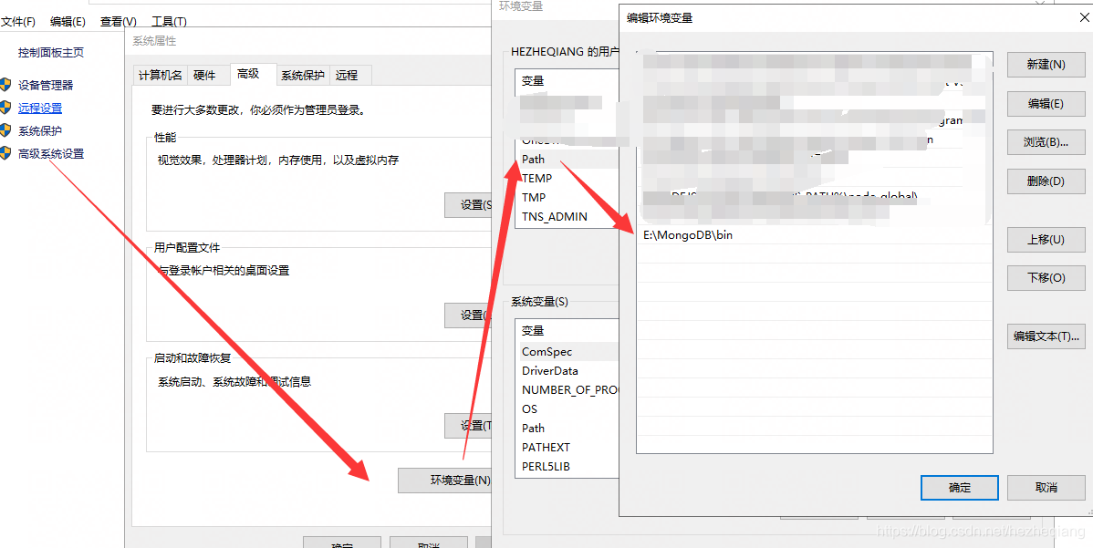 右键我的电脑-属性 -高级系统设置-环境变量-双击path-新增mongodb 路径。点击确定到关闭窗口,环境变量添加完毕!