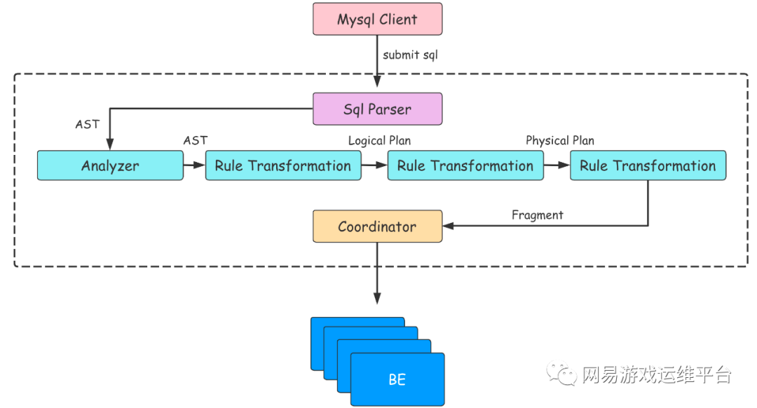 FE 的主要作用将 SQL 语句转换成 BE 能够认识的 Fragment,如果把 BE 集群当成一个分布式的线程池的话,那么 Fragment 就是线程池中的 Task。从 SQL 文本到分布式物理执行计划,FE 的主要工作需要经过以下几个步骤: