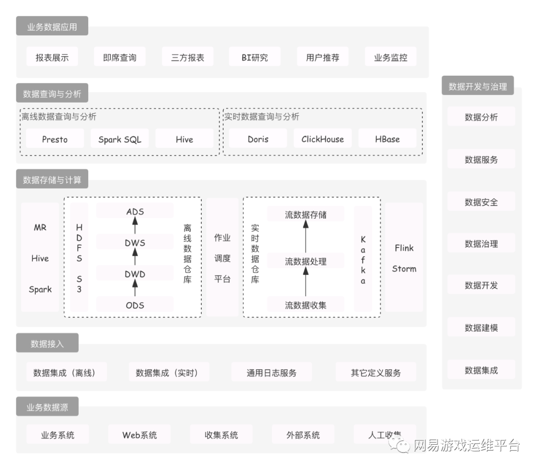 网易互娱于 2021 年 4 月引入了 Apache Doris 产品,目前已经发展为多个集群,服务数十个业务,如游戏舆情分析,实时日活看板、用户事件分析、留存分析、漏斗分析、分布分析等。当前 OLAP 平台与数仓体系融合的架构如下图所示: