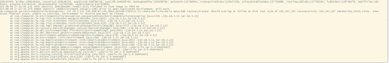 java.io.IOException: the self host 172.31.26.7 does not equal to the host in ROLE file 172.17.0.1. You need to set 'priority_networks' config in fe.conf to match the host 172.17.0.1 at org.apache.doris.catalog.Catalog.getClusterIdAndRole(Catalog.java:903) at org.apache.doris.catalog.Catalog.initialize(Catalog.java:805) at org.apache.doris.PaloFe.start(PaloFe.java:125) at org.apache.doris.PaloFe.main(PaloFe.java:63)