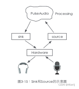 PulseAudio服务软件架构,将来自各个不同的音源转到正确的窗口,针对不同的应用程式做音量的调整,接受多个音源的输入(source)或是输出(sink)。