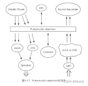 pulseaudio為一個audio service,如下图OSS sink表示输出音源部分,从PulseAudio要转到声音设备的介面。OSS source表示输入音源部分,任何需要进入到PulseAudio的声音,都会经由source介面。