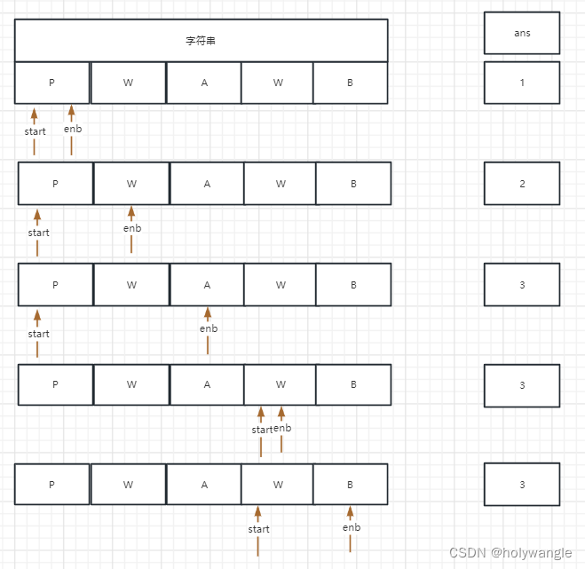 下面是图解: ans代表最长不重复字符的字串的长度