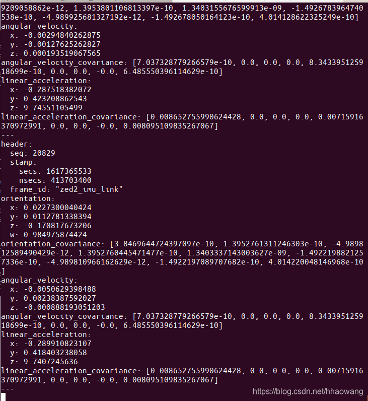 查看rostopic topic内容 /zed2/zed_node/imu/data:
