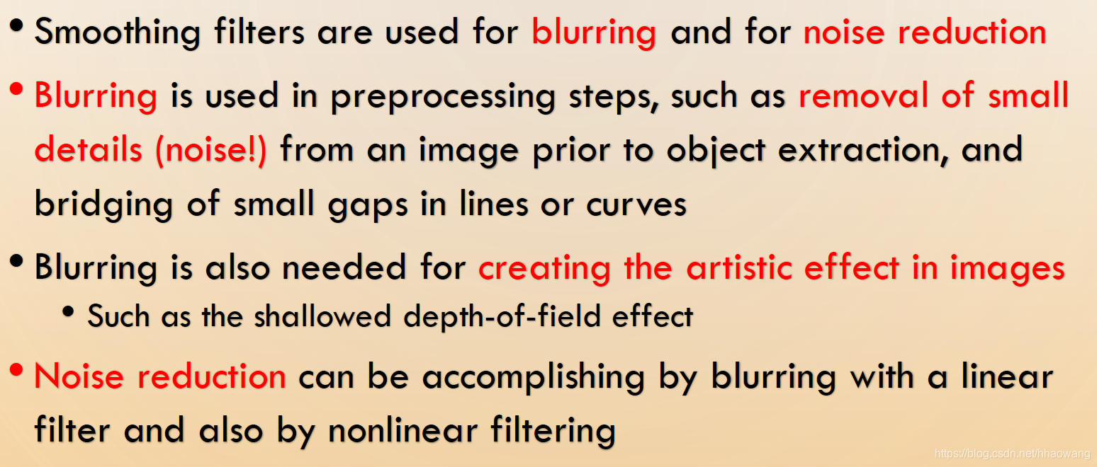 - 如果滤波操作的目的是去噪而不是模糊或平滑,中值滤波操作优势明显;
