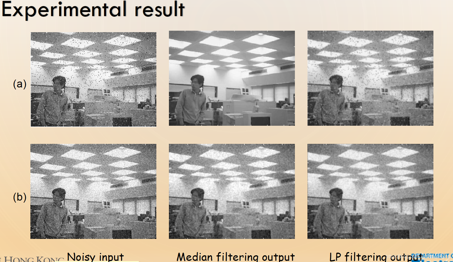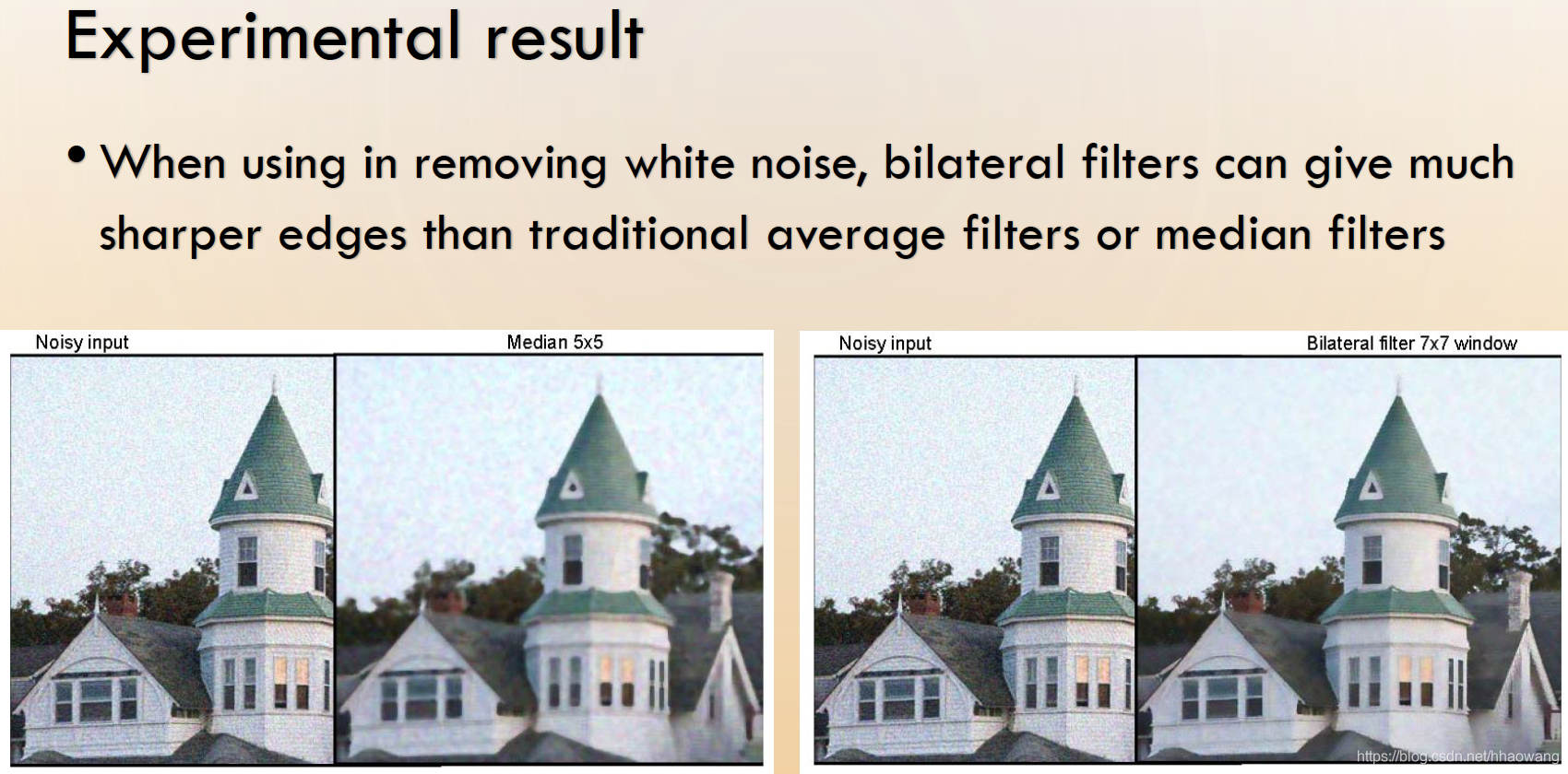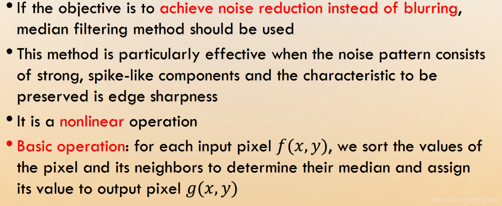 - 中值滤波对强、椒盐噪声明感,可以在去噪的同时保留边缘高频细节,不至于使边缘模糊;