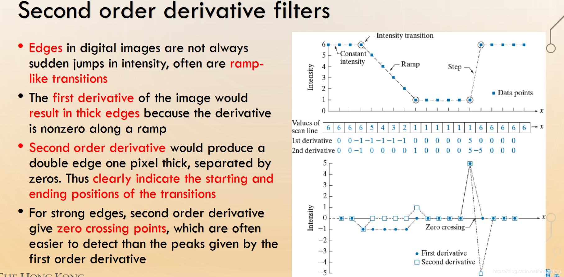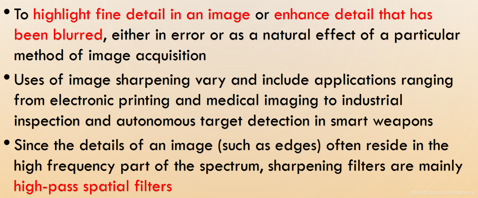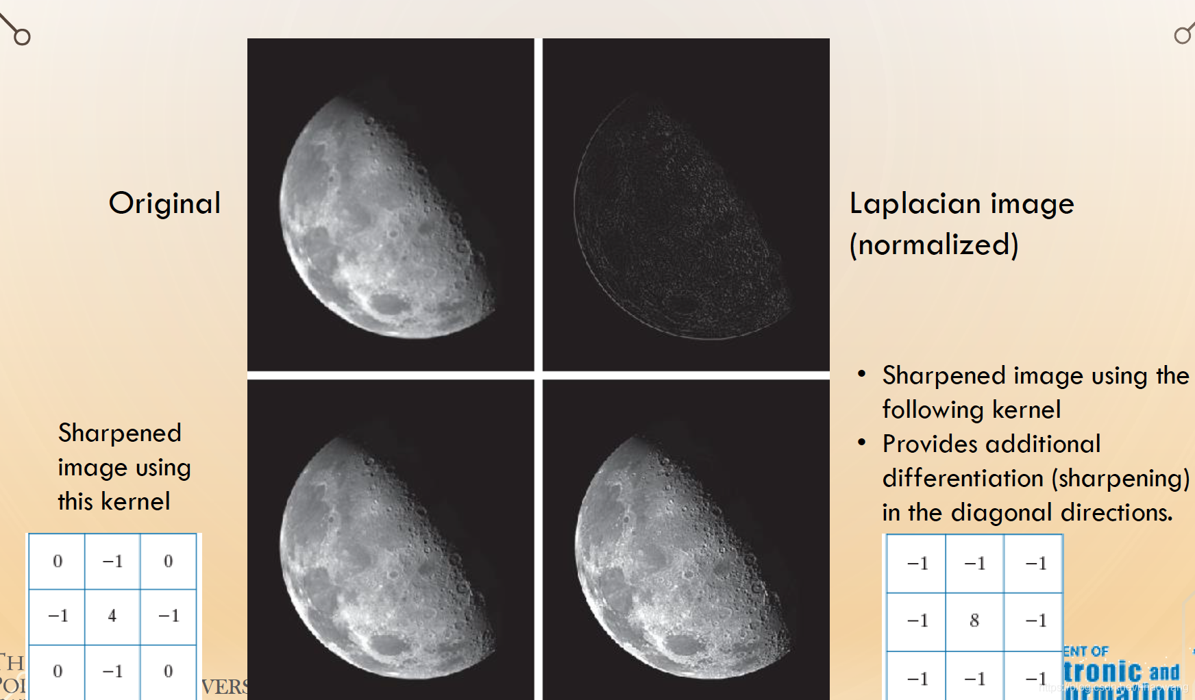 平滑滤波器可以看做是滤波核与像素值得卷积平均,如果要将图像锐化,相反地,应当对图像像素做微分操作,而图像像素值是离散的,微分用差分代替。