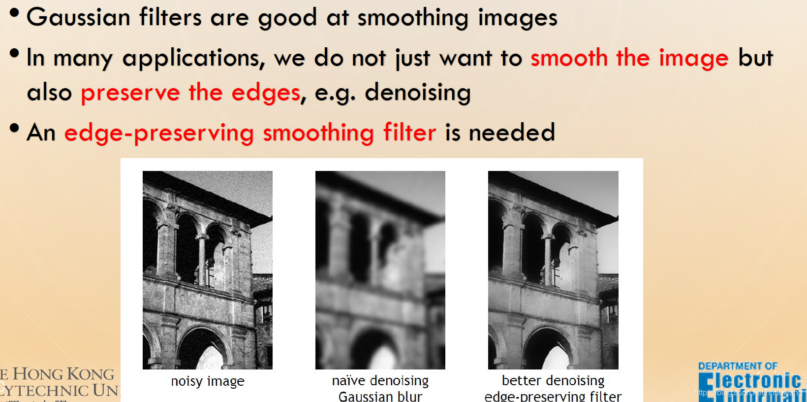 - 然而,在很多应用场景中,我们在要求图像平滑的同时,也要保留图像的边缘细节,例如:去噪;
