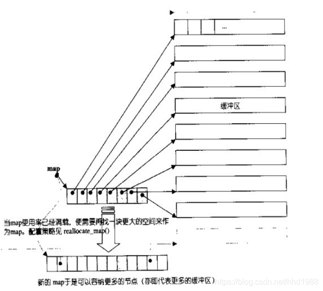 deque采用类似文件系统的方式存储数据。其中有数个连续空间的缓冲区存储数据。这些缓冲区连接起来,给上层用户一个假象就是,存储的数据空间是连续的。