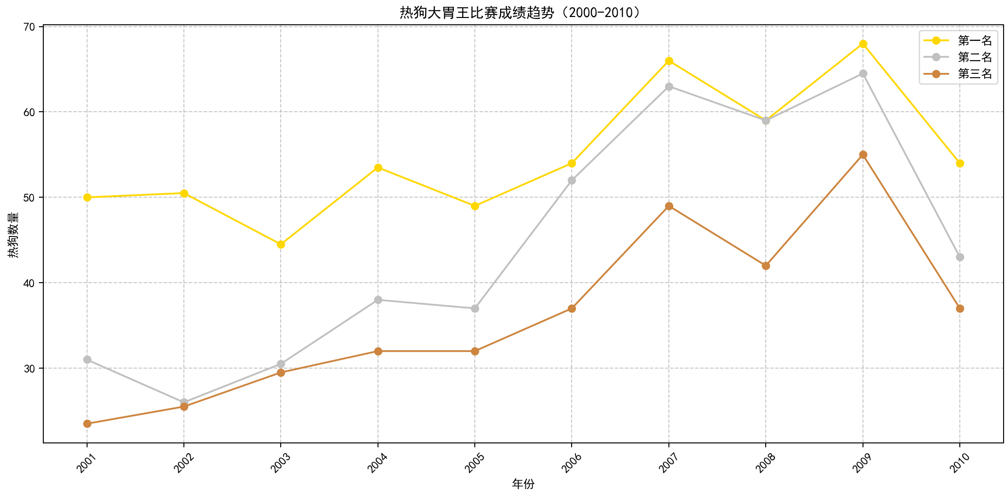 plt.title('热狗大胃王比赛成绩趋势(2000-2010)')