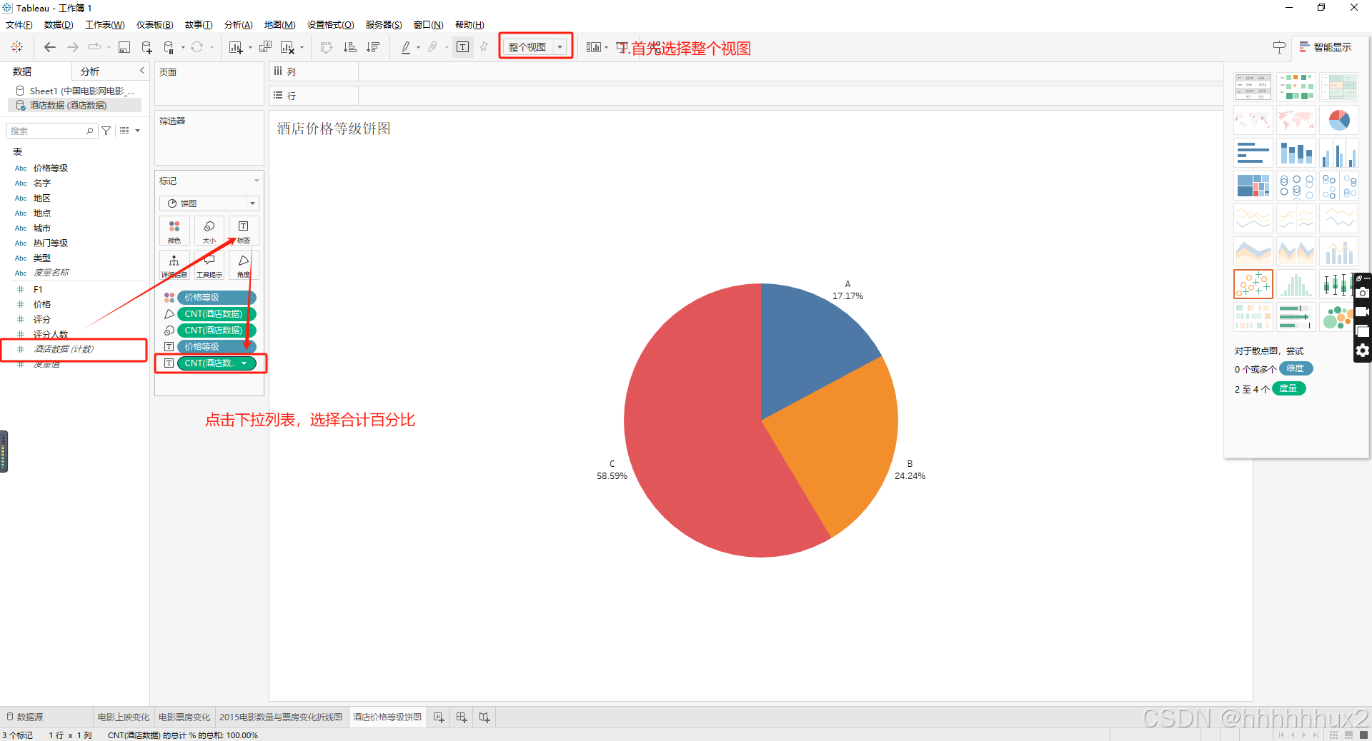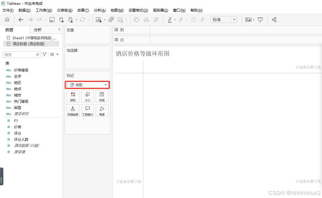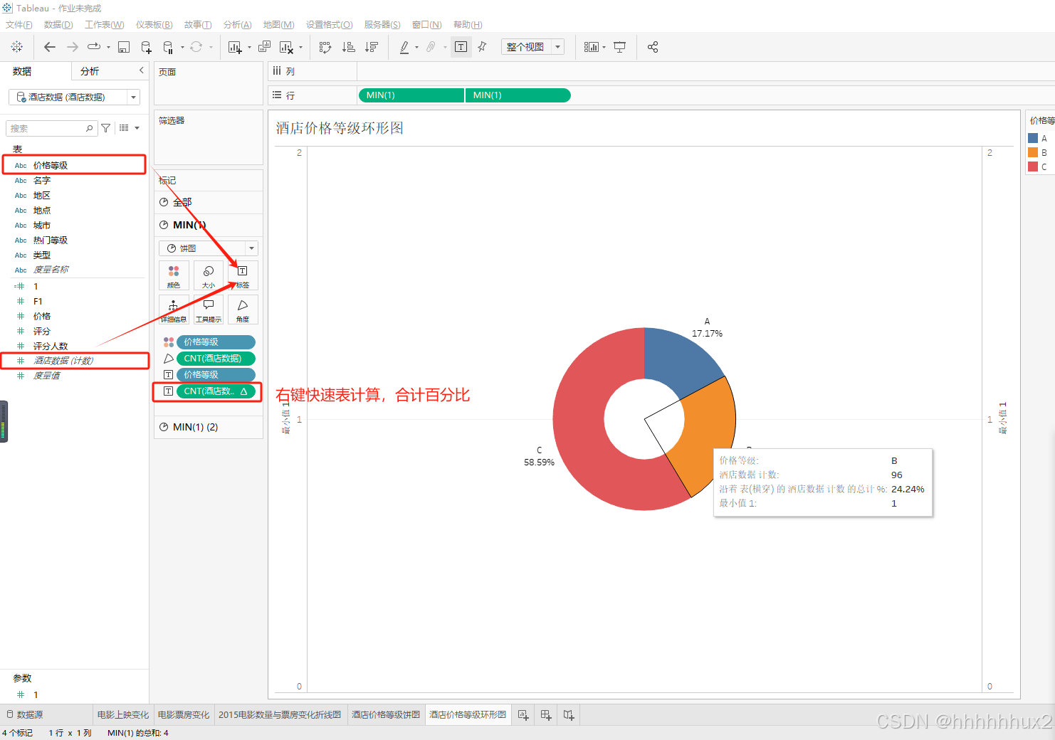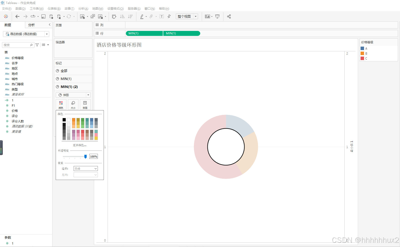 tableau不具备自动生成环形图的能力,所以需要用两个饼图,通过调整饼图的颜色来完成环形图的设置