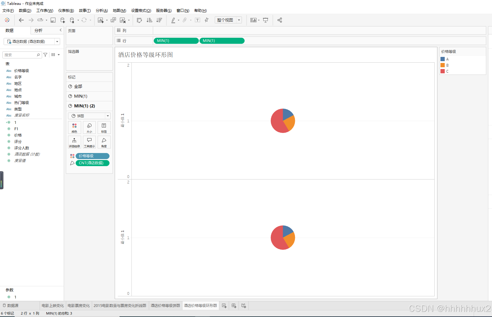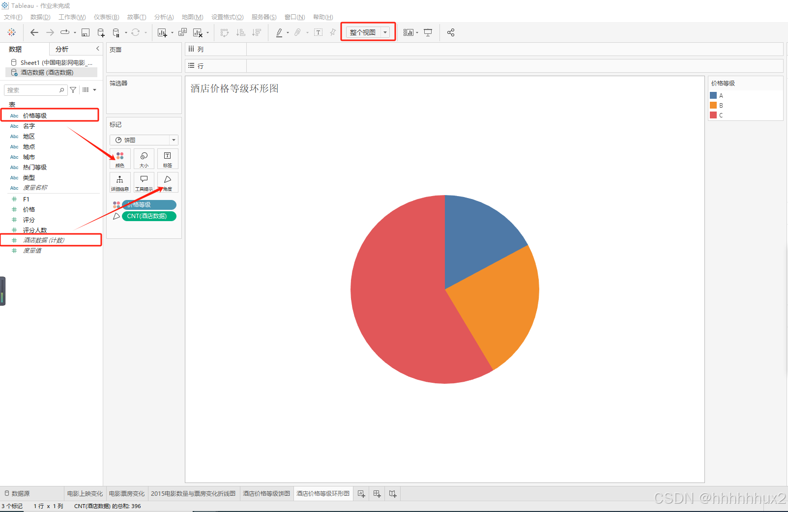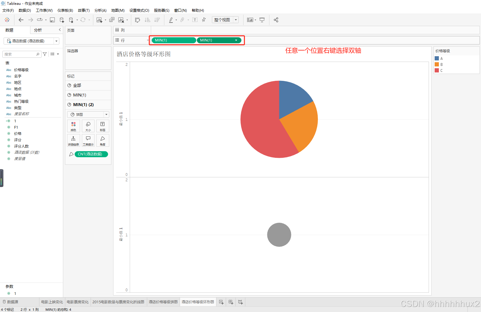 tableau不具备自动生成环形图的能力,所以需要用两个饼图,通过调整饼图的颜色来完成环形图的设置