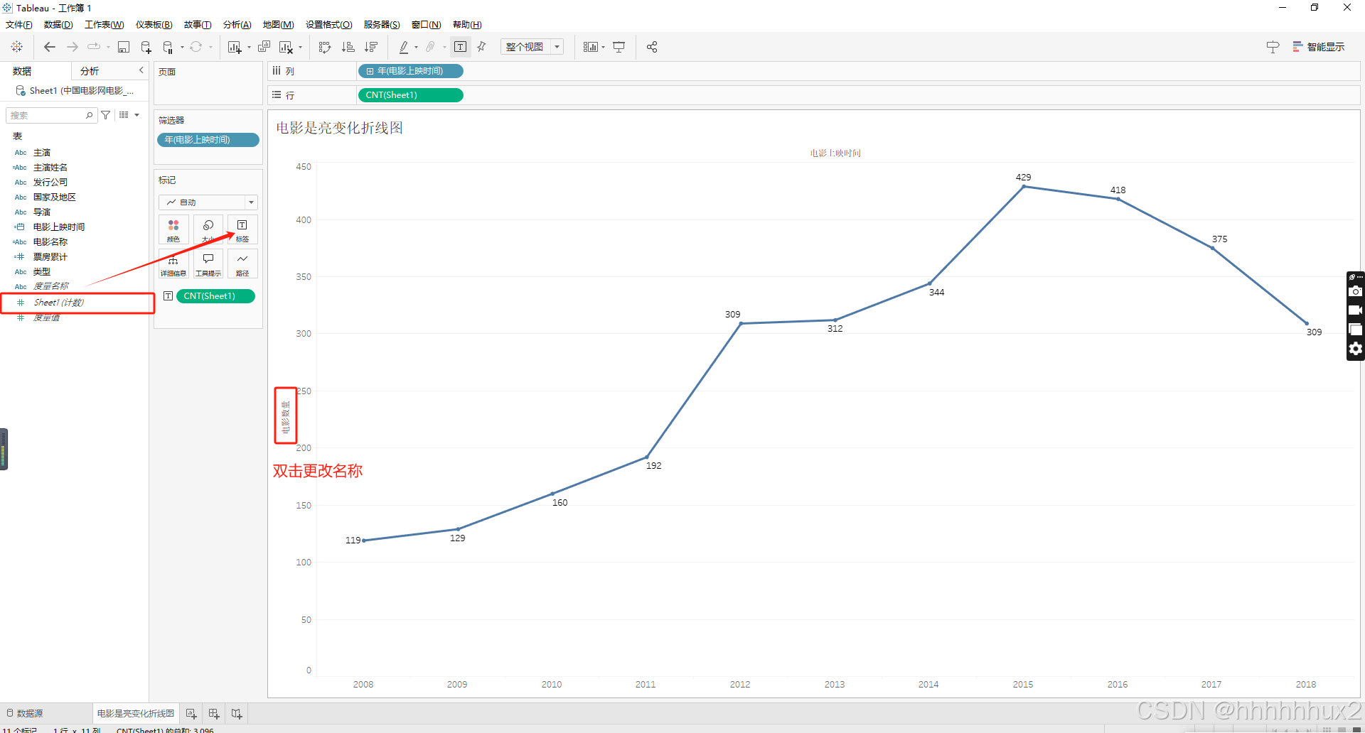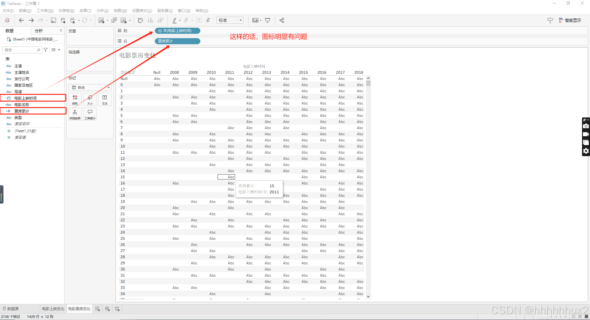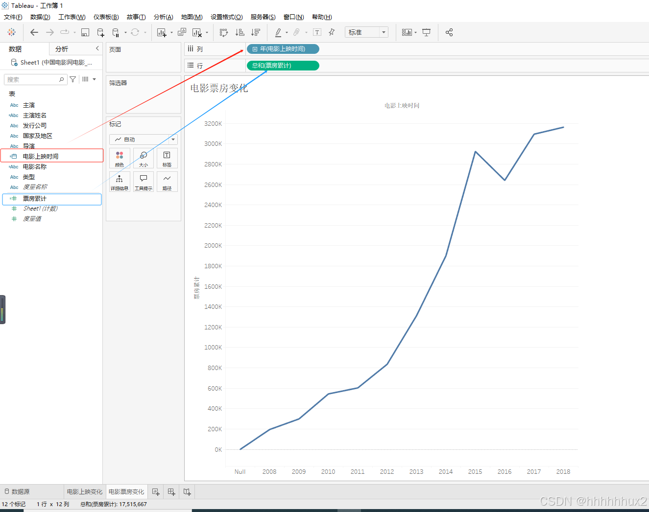 把无效数据排除掉,同是把票房累计拖拽到标签处,即可显示对应年份票房数量.