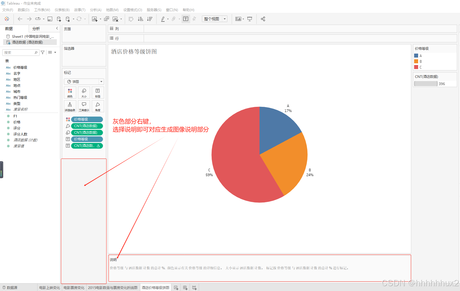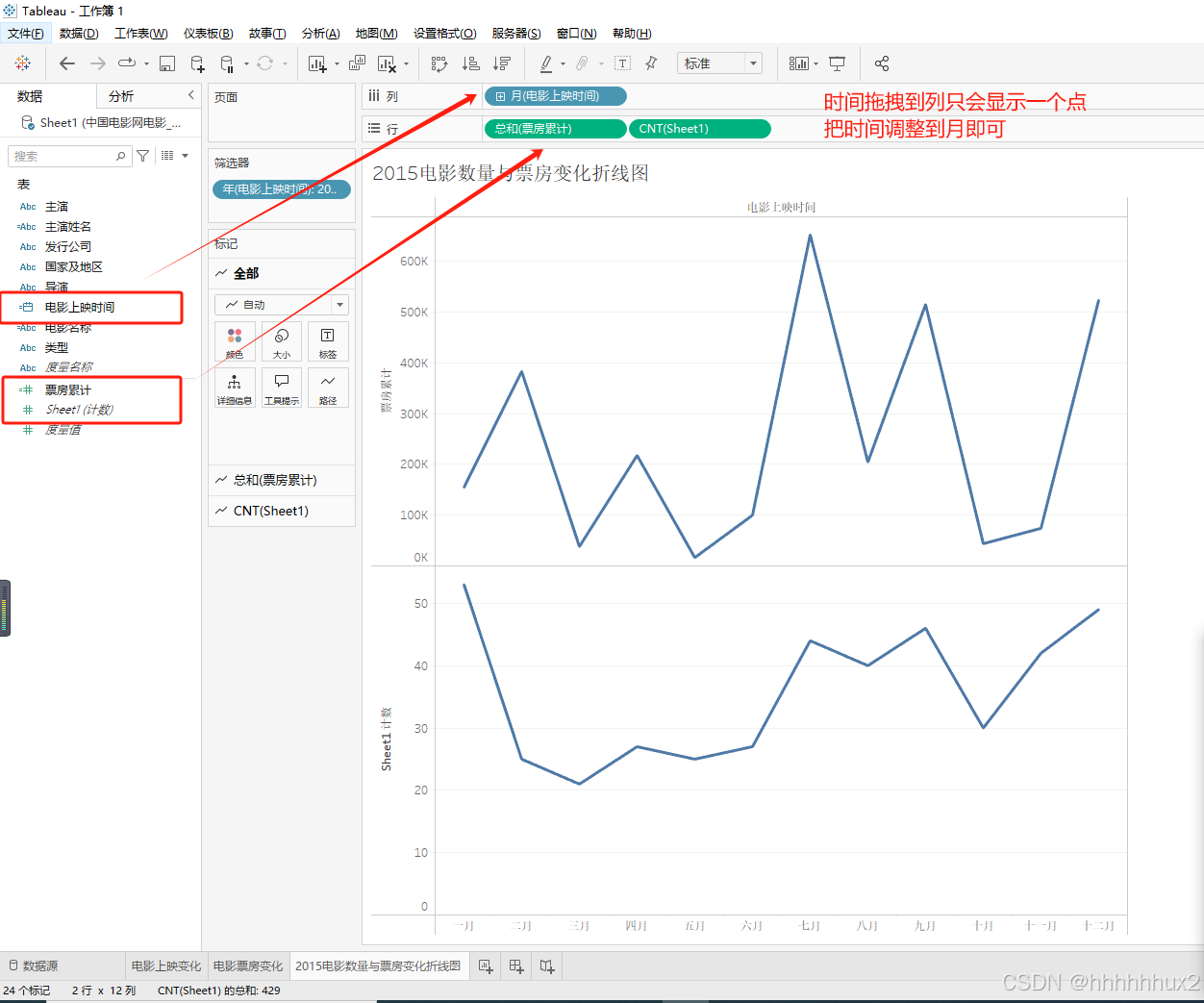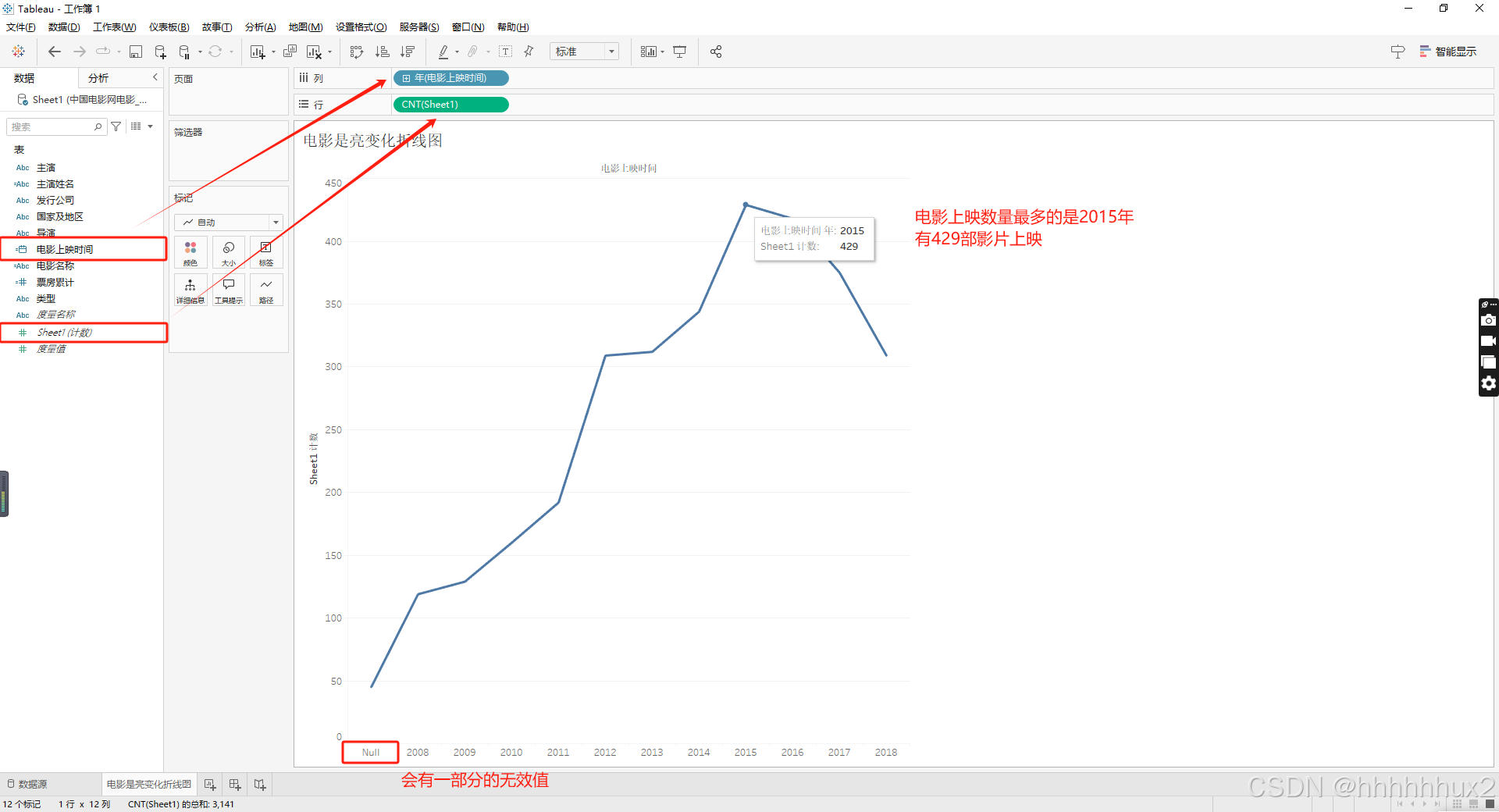 把无效数据排除掉,同是把票房累计拖拽到标签处,即可显示对应年份票房数量.
