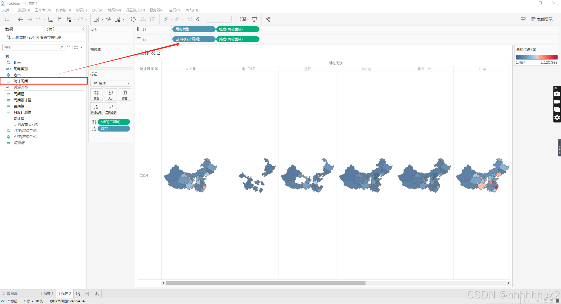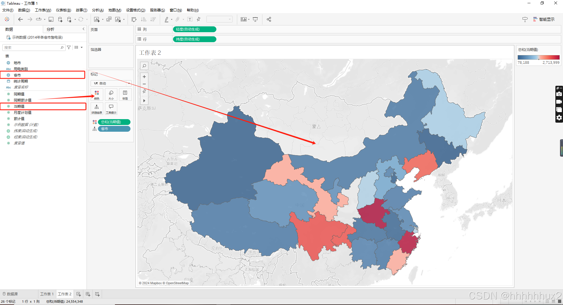 把省市拖拽到工作表区域,把当期值拖拽到标签的颜色处