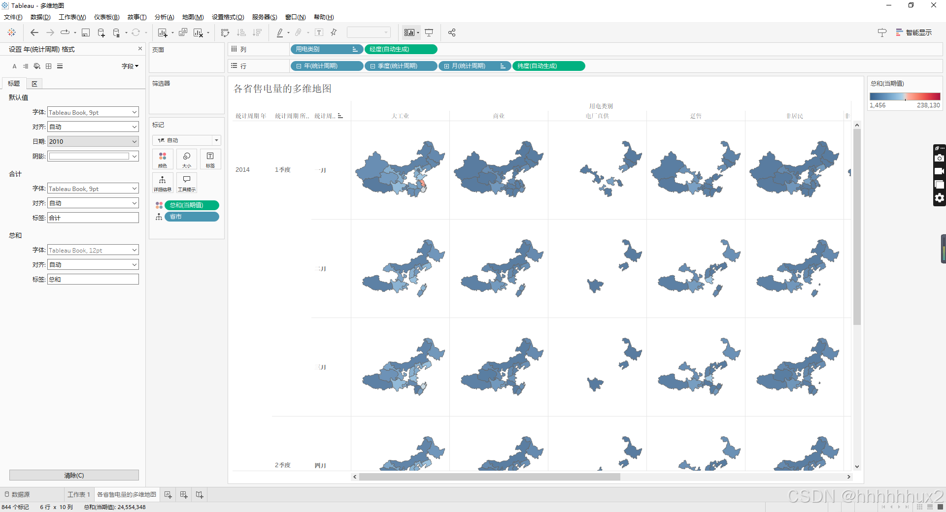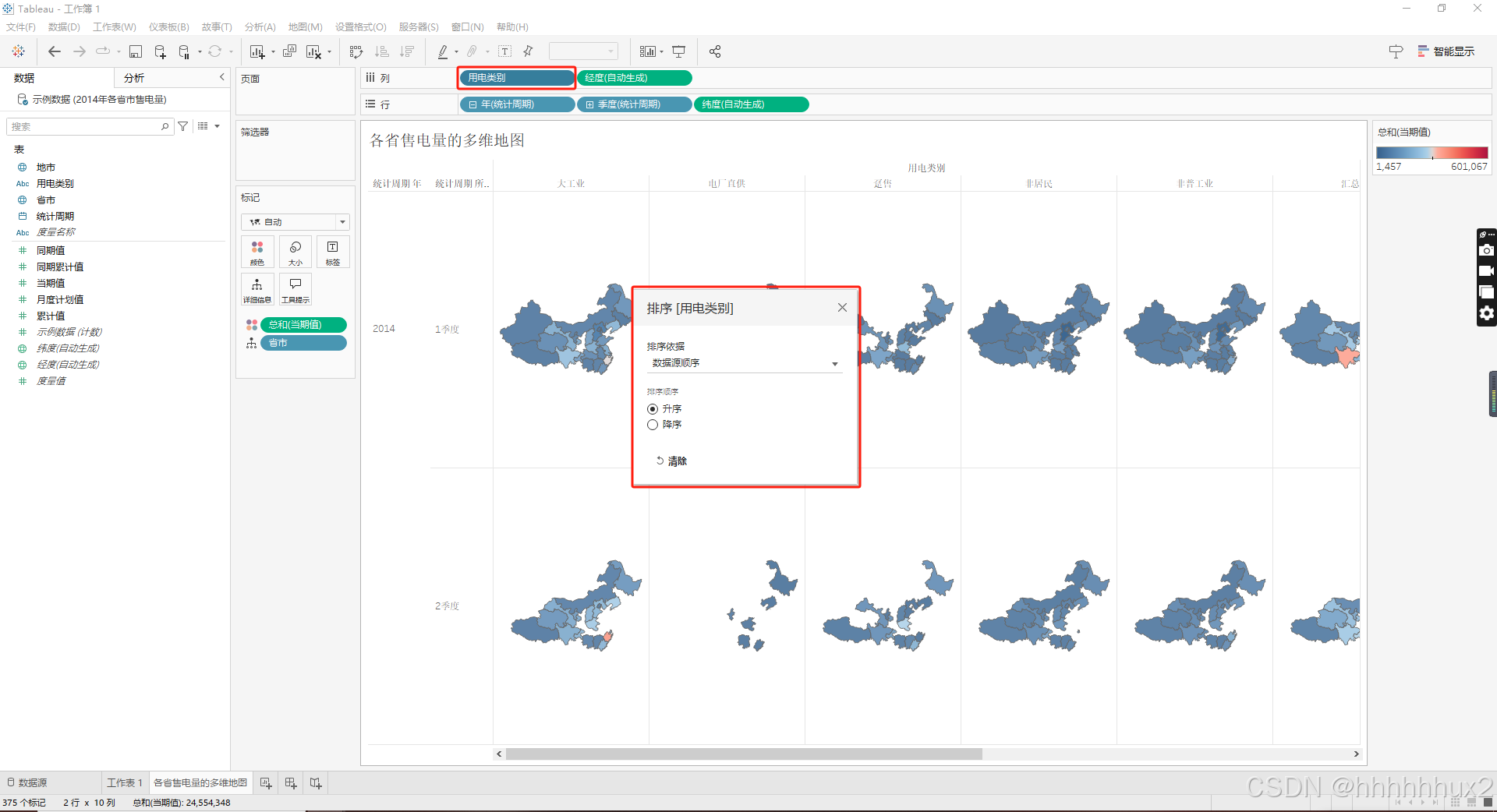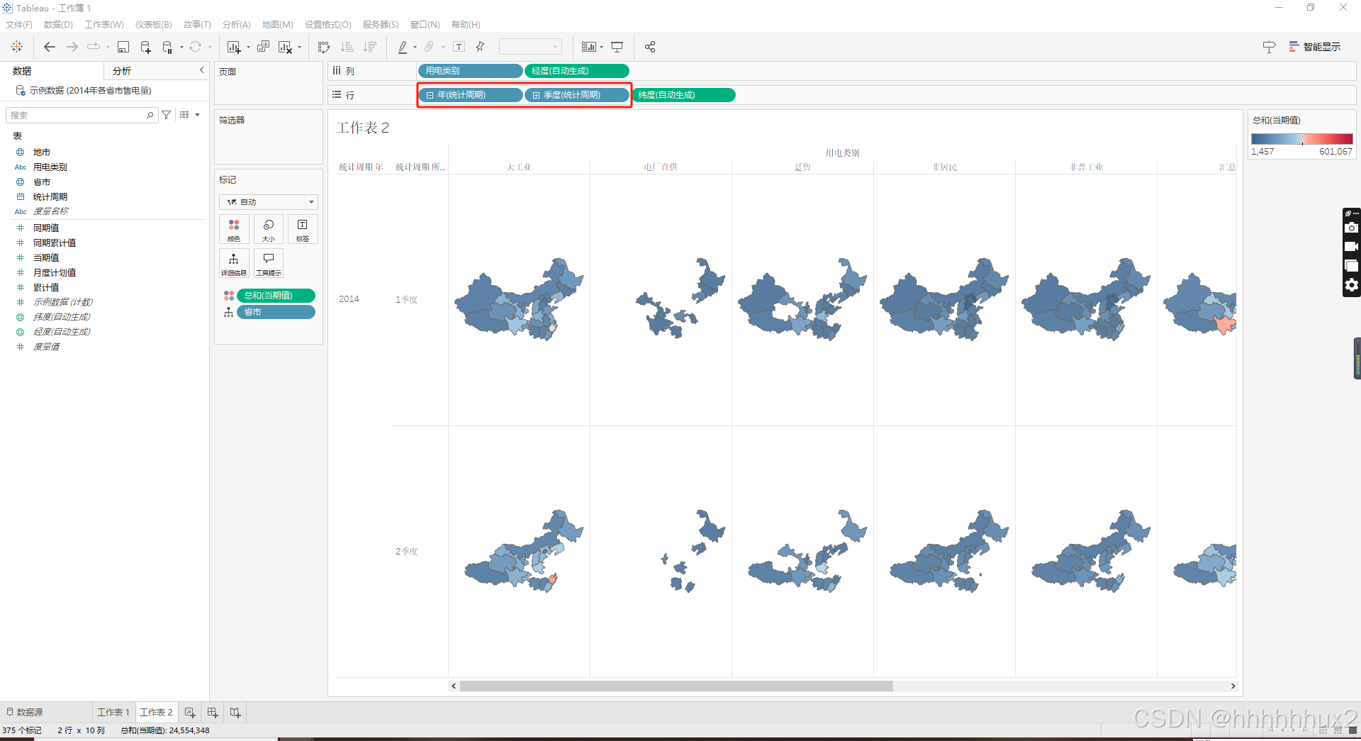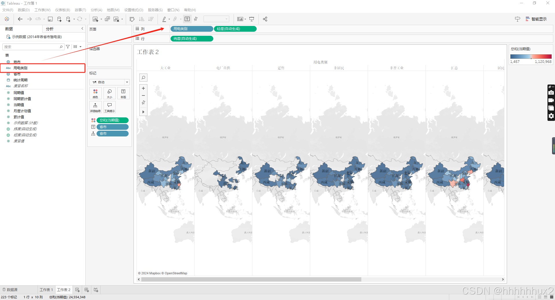 如果我们想看不同的用电类别的销售情况和分布情况,那么可以把用电类别拖拽到列标签处