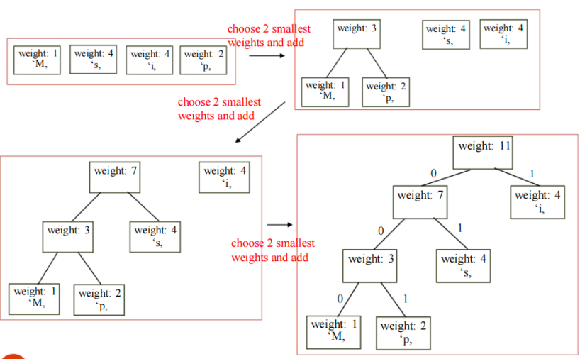 - 构建哈夫曼编码树时,使用的贪心算法,具体过程如下:To construct a Huffman coding tree, use a greedy algorithm as follows: