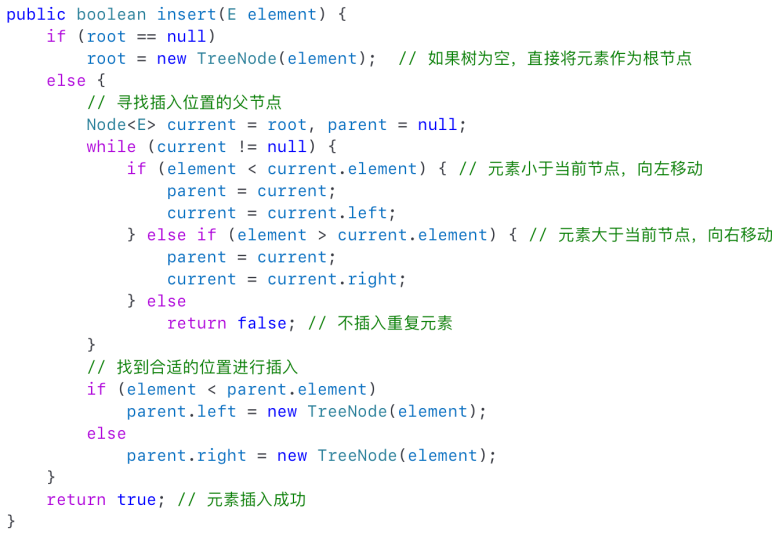 - 找到父节点的位置后,比较元素与父节点的值,并将新创建的节点附加到父节点的左子树或右子树上。After finding the parent node location, compare the element with the value of the parent node, and attach the newly created node to either left or right of the parent