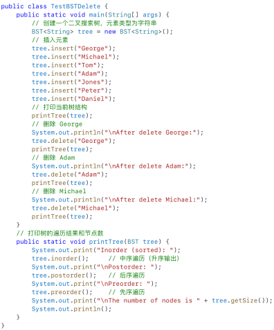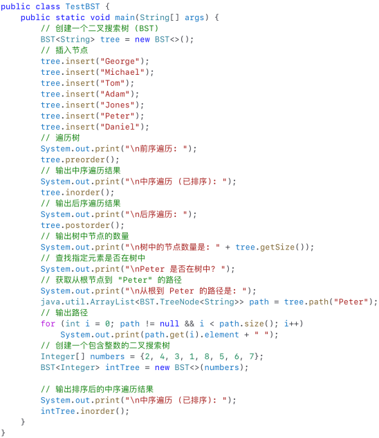 - TestBST 类包含主方法,程序从这里开始执行,并在其中对所有操作进行测试TestBST includes the main method where the program execution begins and all operations are tested.
