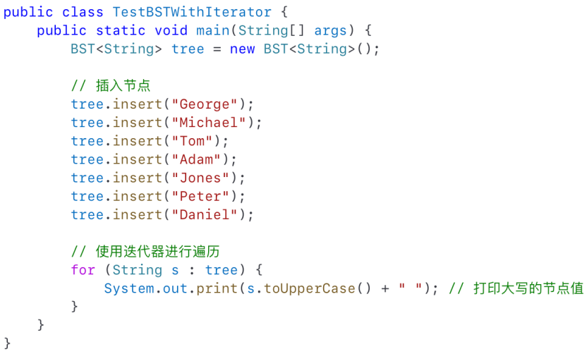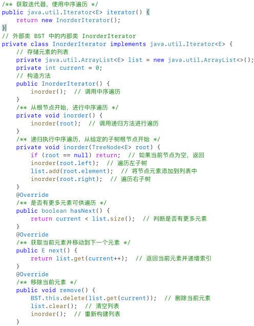 ·因此我们可以直接在 `BST` 中定义一个迭代器类,**实现 `java.util.Iterator` 接口**。这样就可以使用增强的 `for` 循环对树元素进行遍历与处理。So we directly define an iterator class in BST to implement the java.util.Iterator interface.