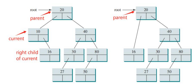 ·current 指向要删除的节点,parent指向其父节点。Let current point to the node that contains the element to be deleted in the binary tree and parent point to the parent of the current node