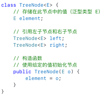 - 二叉树可以通过一组链式节点来表示:每个节点包含一个元素值,并有两个链接,分别命名为left和right,它们分别引用左子节点和右子节点。A binary tree can be represented using a set of linked nodes: each node contains an element value and two links named left and right that reference the left child and right child