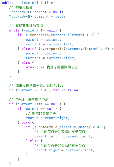 - 要从二叉树中删除一个元素,首先需要找到包含该元素的节点(记作 `current`)以及它的父节点(记作 `parent`)。To delete an element from a binary tree, you need to first locate the node that contains the element and also its parent node