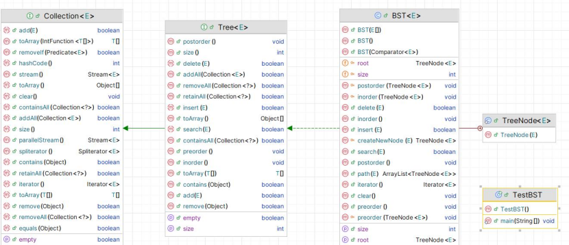 - Tree 接口扩展自 java.util.Collection,而 Collection又扩展了 java.lang.Iterable,因此 BST` 也是 Iterable 的子类。The Tree interface extends java.util.Collection. Since Collection extends java.lang.Iterable, BST is also a subclass of Iterable.
