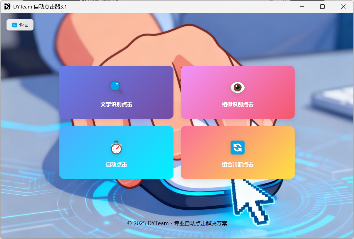DYTeam ClickHtmlProject 是一个基于 PyQt5 + HTML/JavaScript 的桌面自动化点击工具,集成了 OCR 文字识别、图像相似度对比、定时点击等多种功能。项目采用模块化设计,支持打包成独立可执行文件,无需安装额外依赖即可运行。